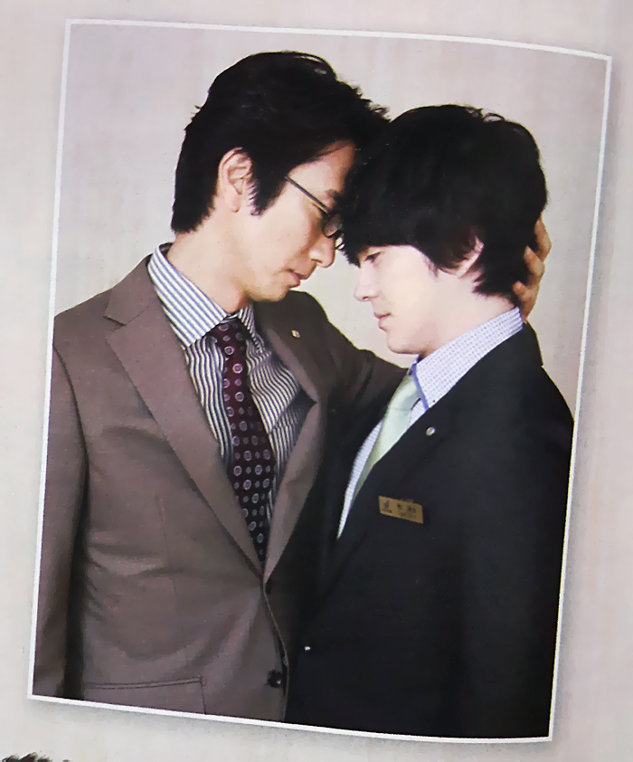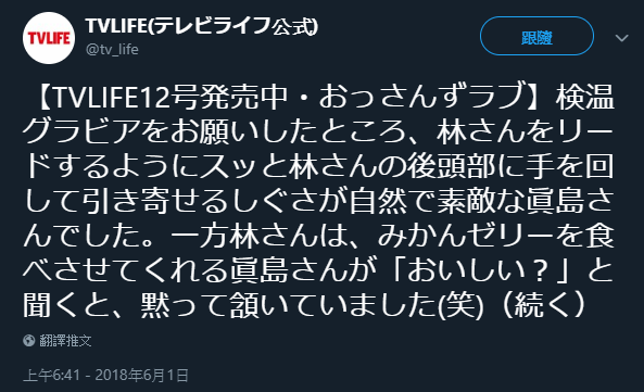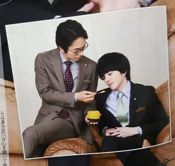 在拜託兩人拍攝測量額溫的照片時,真島さん像是領導著遣都一樣托住他的後腦杓往自己這邊靠,非常的自然又帥氣。另一方面,被餵了橘子果凍的遣都聽見真島さん問他:「 好吃嗎? 」就這樣默默的點了點頭( 笑 )